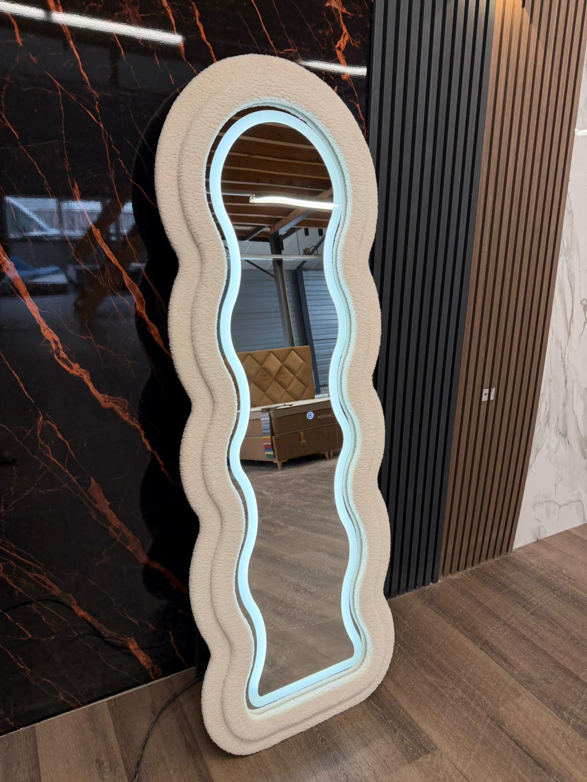 Deze design staanspiegel van 170x60 cm combineert een organische vorm met zachte witte teddy bekleding en ingebouwde LED-verlichting. Het unieke silhouet geeft de spiegel een moderne, speelse uitstraling, terwijl het full body formaat perfect is voor het checken van je outfit van top tot teen.